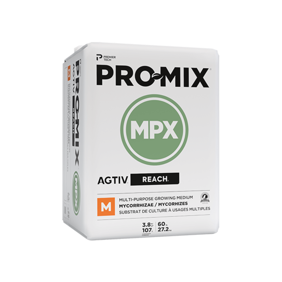 PRO-MIX MPX AGTIV REACH is a multi-purpose, peat-based growing medium that combines high-quality Sphagnum peat moss and a low percentage of perlite. This combination forms a growing medium with high water retention that reduces the need for frequent irrigation and promotes water conservation. Contains a beneficial endomycorrhizae that improves plant growth.