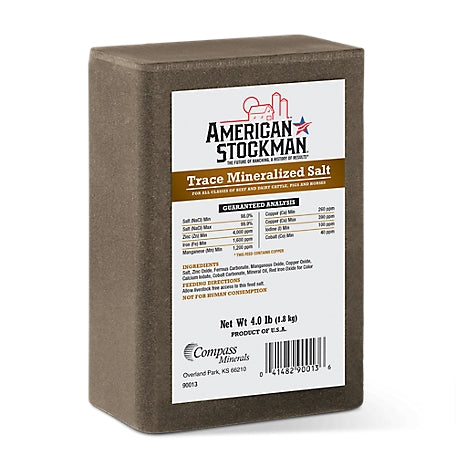 Trace Mineral Salt Block is specially formulated cattle feed designed to help meet the salt and trace element requirements of most livestock. The livestock feed includes trace minerals that complement the diet to help promote digestion, growth, maintenance of body tissues, proper reproductive processes, and general animal well-being.