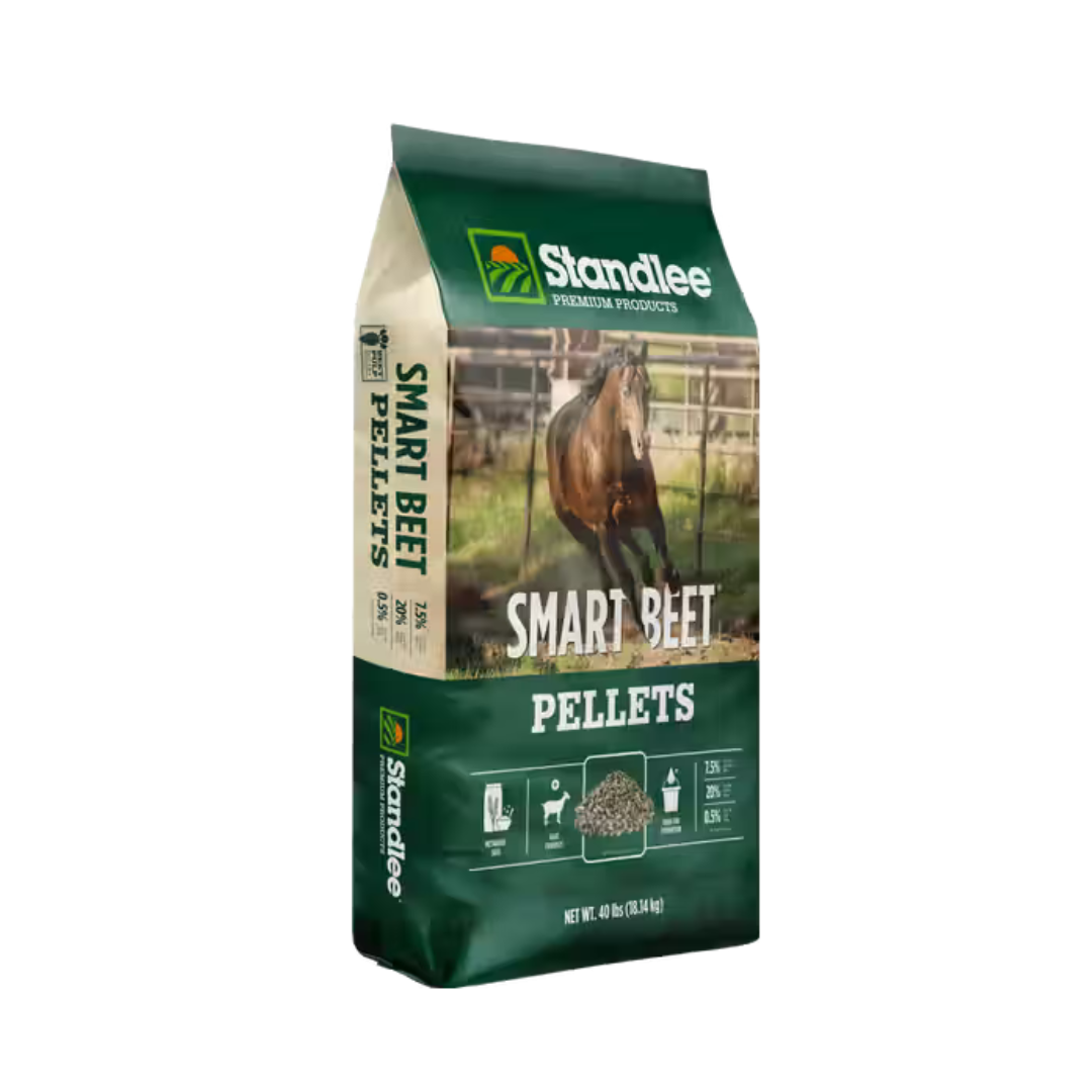 Standlee Smart Beet Pellets are a premium beet pulp feed for horses and livestock. They are high-density, ¼ inch pellets formed from dried beet pulp after removing the sugar. Smart Beet Pellets are an excellent feed addition to any ration as a low starch, low protein, highly digestible food source for horses, cattle, goats, and sheep