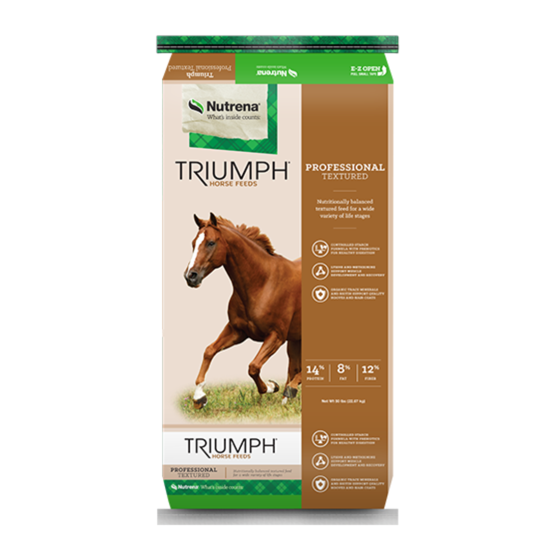 Triumph® Professional Textured Horse Feed is a controlled starch, nutritionally balanced textured feed for a wide variety of life stages.